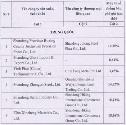 Cụ thể, mức thuế CBPG tạm thời dao động trong khoảng 3,45 – 34,27% được áp dụng đối với hơn 20 công ty. Trong đó, hàng loạt công ty Trung Quốc chịu mức thuế cao nhất là 34,27% như Shangdong Boxing Huaye Industry & Trade Co.,Ltd., Wuhan Hanke Color Metal Sheet Co., Ltd, Bazhou Shengfang Zhixing Pipe Making Co.,Ltd….