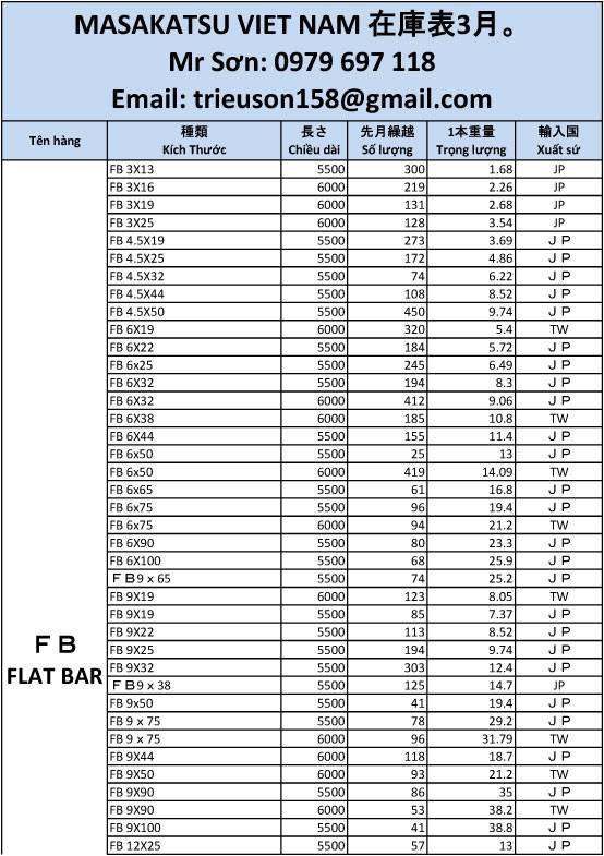 Công ty MASAKATSU KOUZAI VIETNAM . 100% vốn Nhật Bản.Chuyên cung cấp các mác thép SS400. như Flat bar , thép tấm, thép hình ( U. V I ) láp tròn , vuông , và thép hộp . các loại thép đặc chủng..Với đầy đủ các chủng loại và kích thước khác nhau.Sản phẩm đầy đủ chứng chỉ chất lượng của nhà sản xuất.