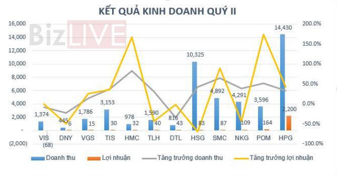 Dẫn đầu phải kể đến Tập đoàn Hòa Phát (mã HPG) với 14.430 tỷ doanh thu và 2.200 tỷ đồng lợi nhuận sau thuế, tăng lần lượt 34% và 43% so với cùng kỳ. Lũy kế 6 tháng, HPG đạt doanh thu 27.595 tỷ đồng, tăng 30%, lãi sau thuế 4.425 tỷ đồng, tăng 27% so với nửa đầu năm 2017.