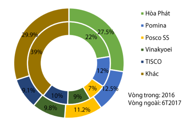 Theo số liệu của VSA, tính đến cuối tháng 6/2017, Thép Hòa Phát (HPG) đang dẫn đầu về thị phần thép xây dựng với 27,5%; Thép Pomina đứng thứ hai với 12,5% thị phần; Posco 11,2%; Vinakyoei 9,8%; Tisco 9,1%; 29,9% còn lại thuộc về các doanh nghiệp khác.
