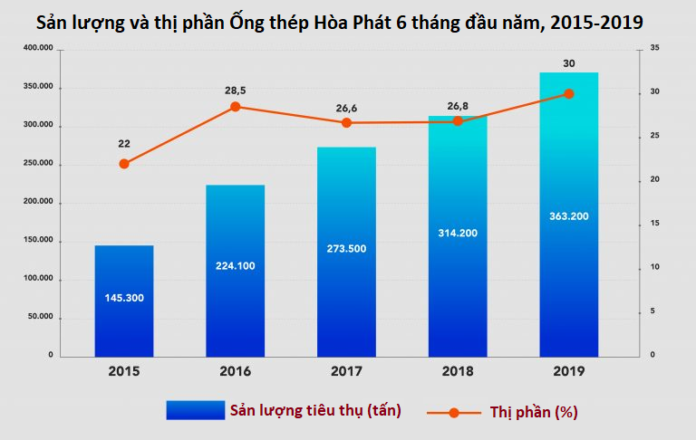 Sản lượng tiêu thụ và thị phần Ống thép Hòa Phát 6 tháng đầu năm, 2015-2019. Nguồn: Hòa Phát