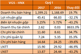 Giải trình về kết quả doanh thu tăng, VGS cho biết giá bán bình quân trong quý I/2017 tăng 30% so với cùng kỳ năm ngoái. Tuy vậy, tỷ giá USD cao từ 22.260 đồng/USD tăng lên 22.820 đồng/USD lại khiến cho giá nguyên liệu nhập bị đội lên khoản lớn do chủ yếu nhập khẩu. Ngoài ra, việc giá bán tăng cao khiến cho tồn kho cũng tăng lên gần 300 tỷ đồng, chi phí lãi vay cũng tăng thêm tương ứng.