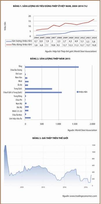 Năm 2014, Việt Nam sản xuất 5,8 triệu tấn thép thô, nhưng tiêu dùng lên tới 16,8 triệu tấn, như vậy Việt Nam phải nhập (thuần) 11 triệu tấn thép thô (xem bảng 1). Cũng cần nói qua là thống kê này là do Hiệp hội Thép thế giới biên soạn và xuất bản, tính theo số tương đương thép thô, để giải quyết việc tổng hợp các sản phẩm rất khác nhau, từ quặng, sắt thô sơ chế và thành phẩm, mà người sản xuất có thể tham gia vào các giai đoạn khác nhau, do đó mà số liệu về thép do Tổng cục Thống kê Việt Nam xuất bản tỏ ra không hữu ích vì không thể so với nước khác.