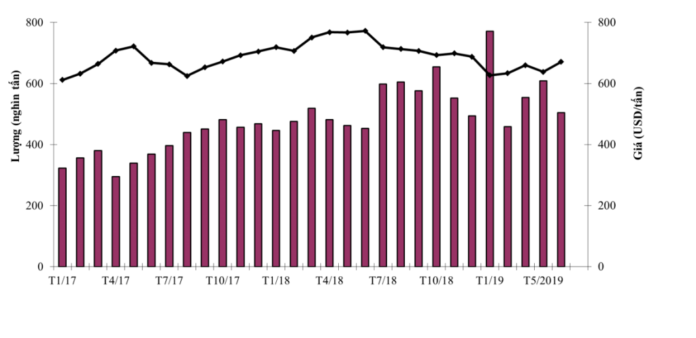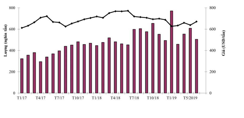 Diễn biến lượng và giá thép xuất khẩu của Việt Nam đến tháng 6/2019. Nguồn: Vinanet