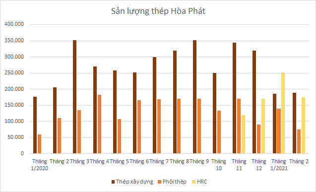 Lũy kế 2 tháng, sản lượng tiêu thụ thép xây dựng thành phẩm, phôi thép và HRC của Hòa Phát đạt trên 1 triệu tấn. Trong đó, thép xây dựng thành phẩm của Hòa Phát đạt 376.000 tấn, riêng lượng thành phẩm xuất khẩu đạt 67.000 tấn. Sản lượng phôi thép xuất bán trong và ngoài nước đạt 214.000 tấn. Sản lượng bán hàng thép cuộn cán nóng (HRC) sau 2 tháng đầu năm đã đạt 428.000 tấn, tương đương 74% sản lượng cả năm 2020.